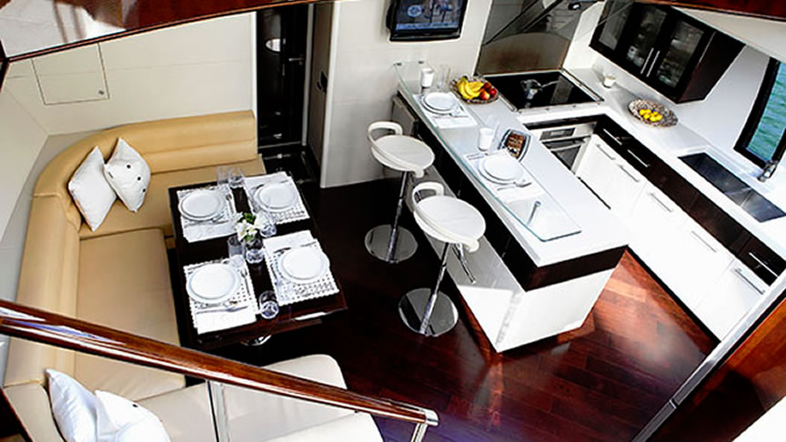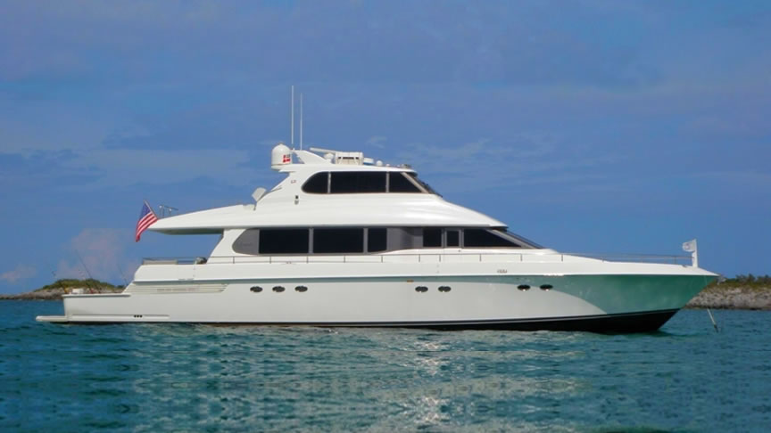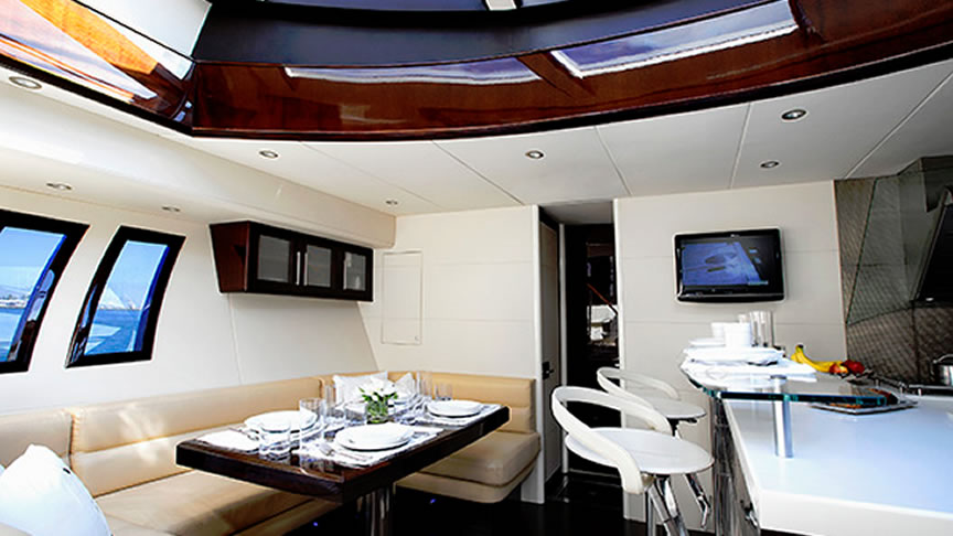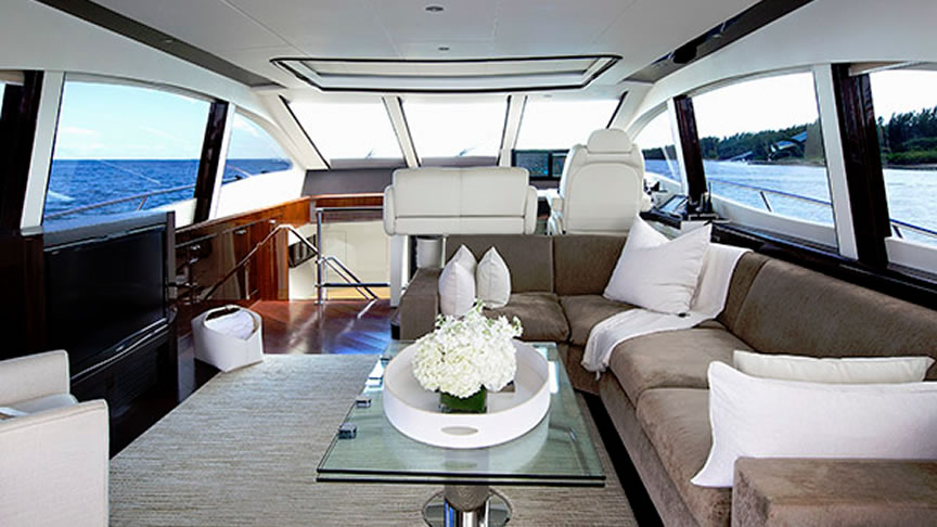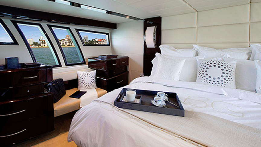 The 76 Lazzara is sleek, modern and gorgeous. Featuring every amenity you could desire, this boat is a home away from home on the water. For a day charter, this boat can accommodate up to twelve guests. To use this yacht for a term charter, up to six guests plus crew can be accommodated. This boat is specially designed for touring the Florida Keys, South Beach, and the Miami shoreline in comfort and style. Large sunbeds (sunpads) on the deck are located to the front and the rear of the boat to showcase the beautiful ocean views. The upper salon boasts a high gloss wood interior, a sunroof, a leather sofa, and a Bose home theater system with a large flat screen television. The lower salon is home to a full galley with stainless steel appliances and granite countertops, as well as an expandable indoor dining option. The spacious master stateroom features a walk around king bed, a large flat screen television and large picture windows for breathtaking views. The master bathroom features marble fixtures and a full sized shower. The two additional staterooms feature one queen sized bed and one double bed with bathrooms.