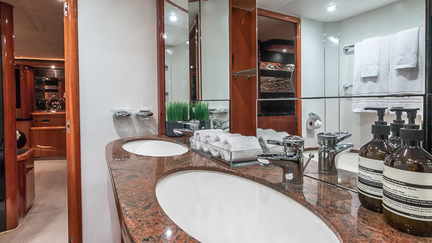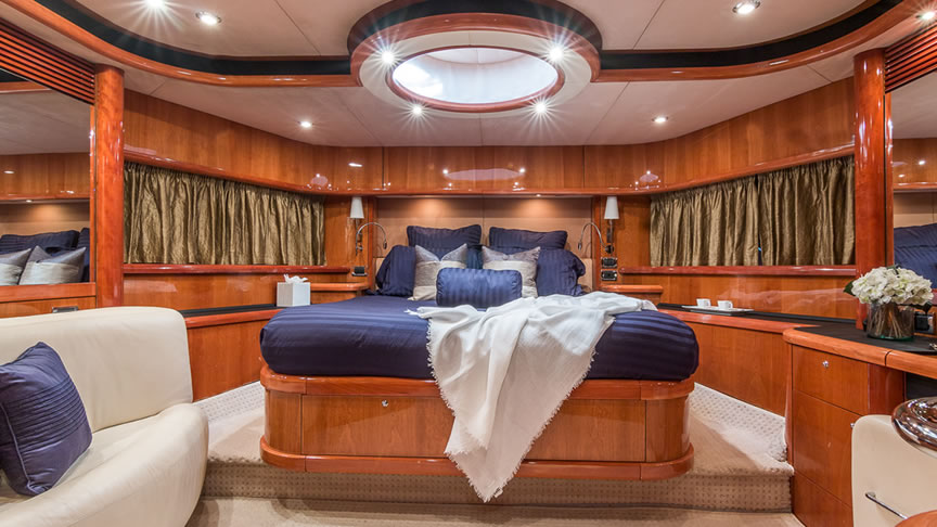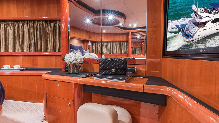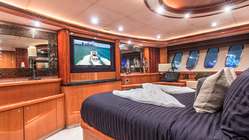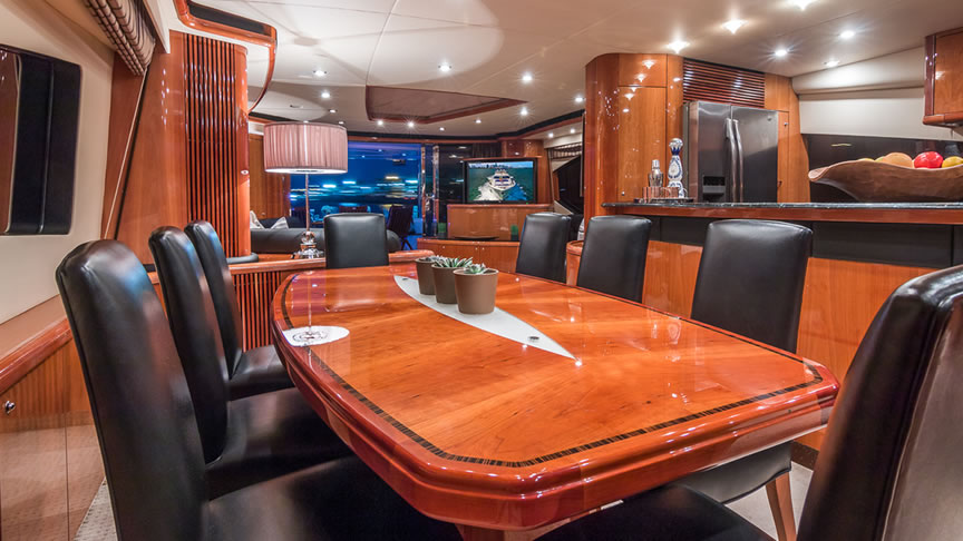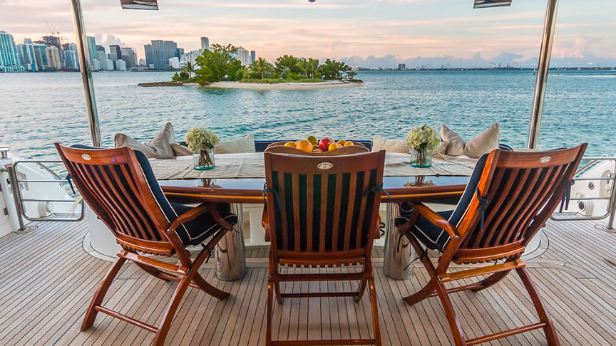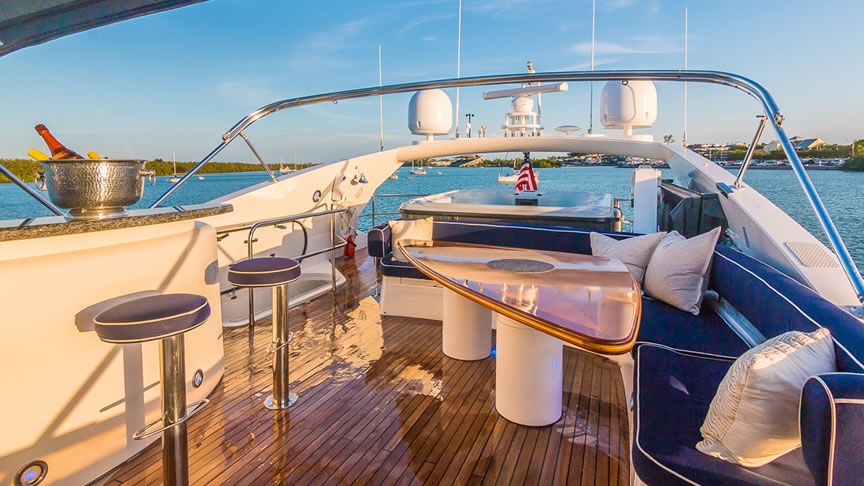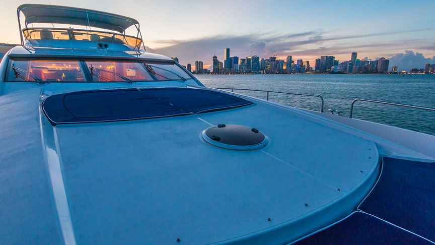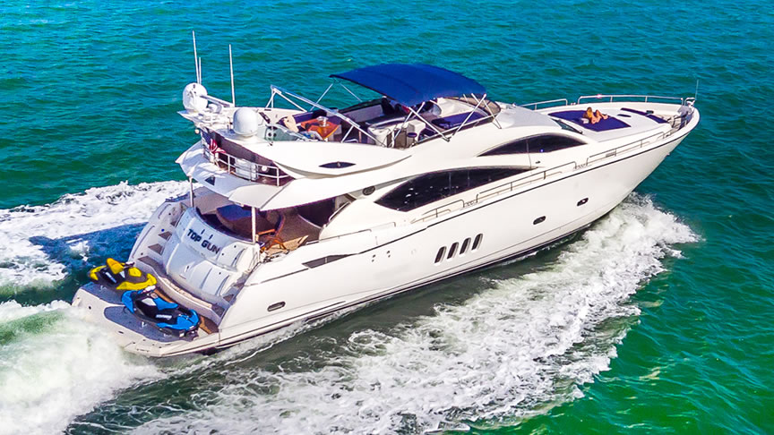 The 82' Sunseeker Top Gun is the ideal yacht for a Miami and South Beach day charter or a term charter to the Florida Keys. Take in the view on board the deck with a wet bar, large dining area, electric canopy to provide shade, and a comfortable sun lounger. With a wave runner and swim platform, this boat is perfect for taking a refreshing dip in the tropical water.
