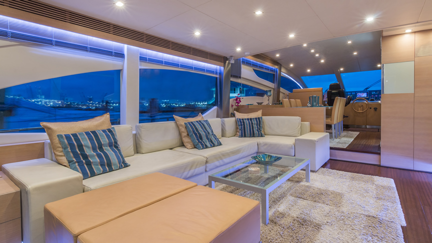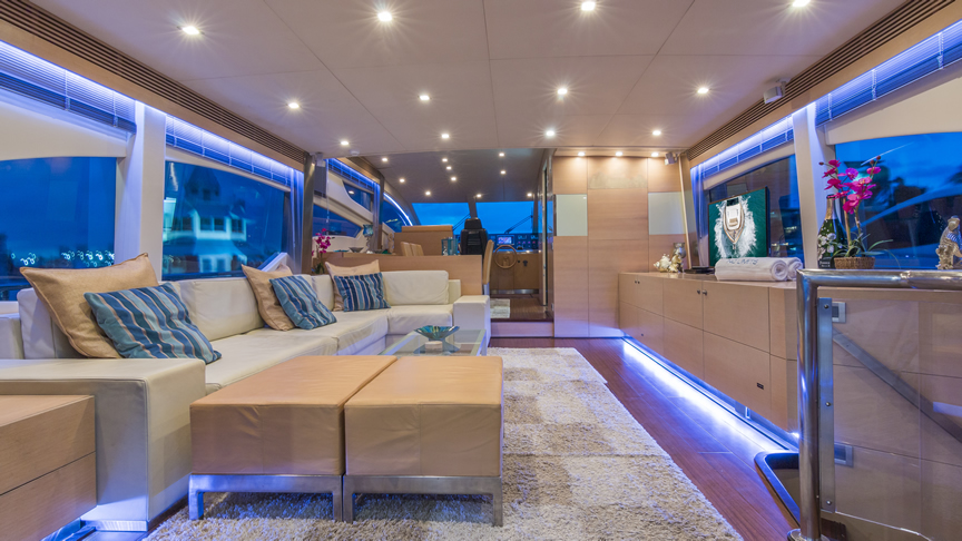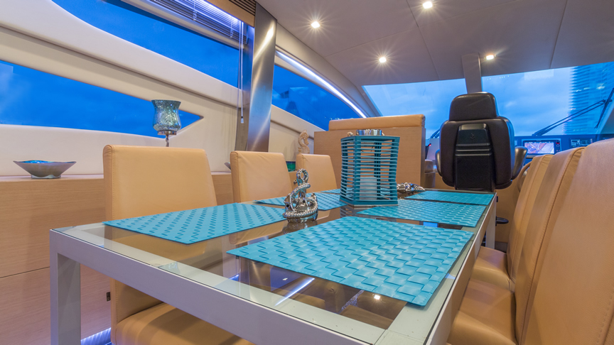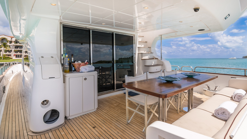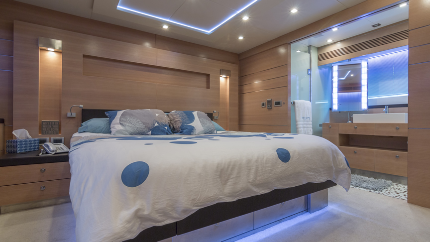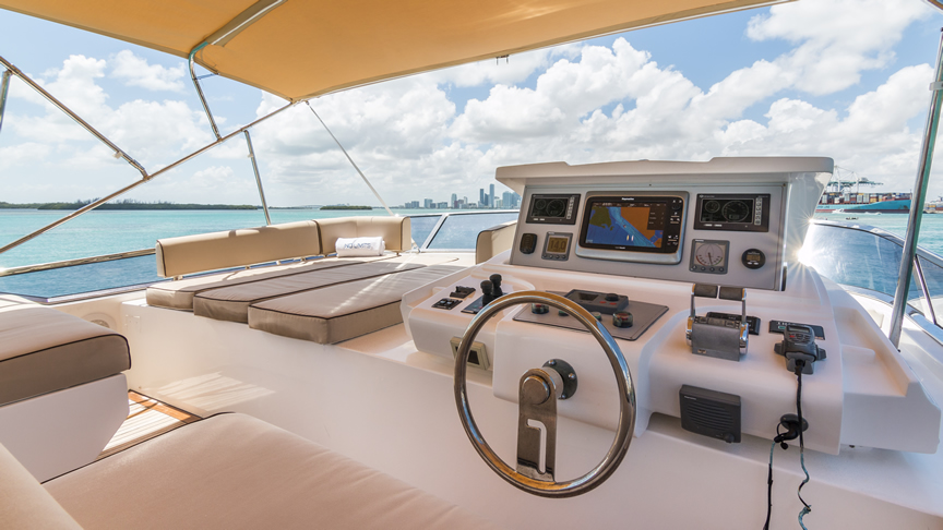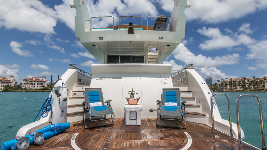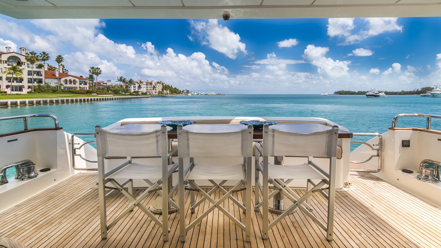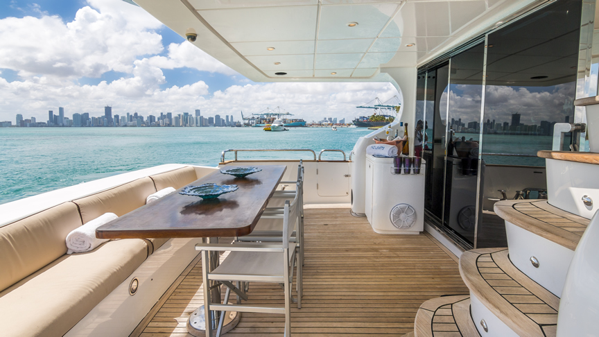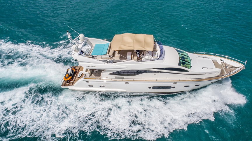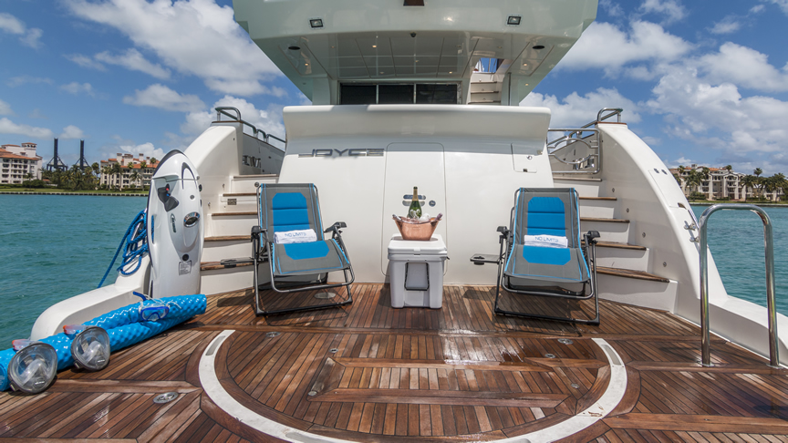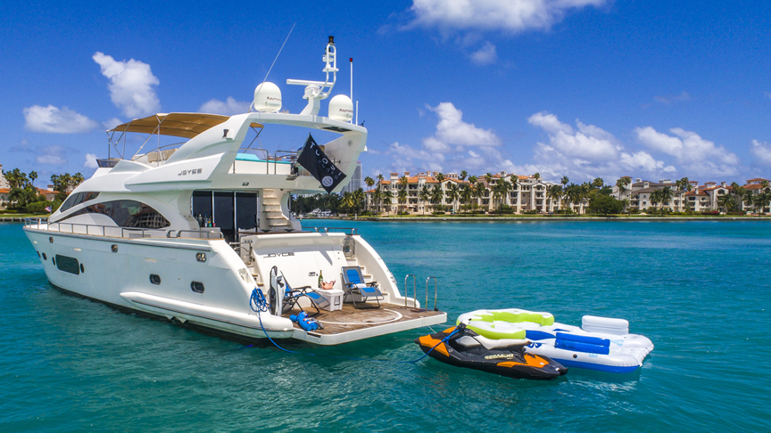 For total luxury, choose the 84 Joyce Flybridge. On the deck, have a drink with your guests, then relax in the jacuzzi. The full galley features a center kitchen island, stainless steel appliances, and a seating area with a leather sofa for guests. The salon holds a large dining room table, cream colored sofas and love seats, and grand picture windows for stunning 360 degree views. With five staterooms, this boat is ideal for large group term charters. A walk around deck and spacious interior make this boat feel much larger than its size.