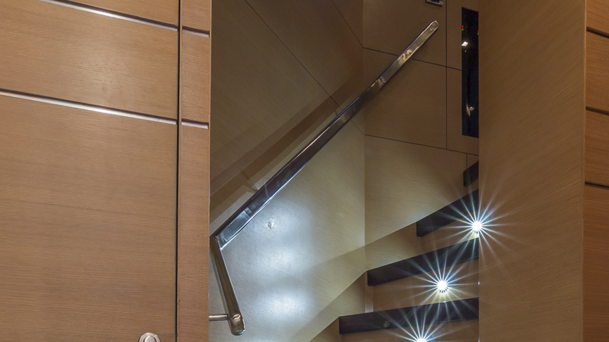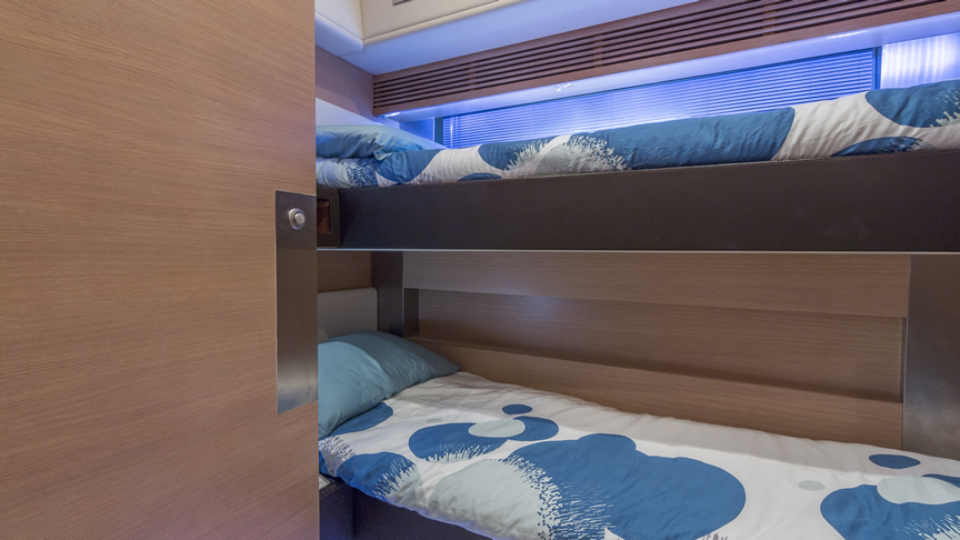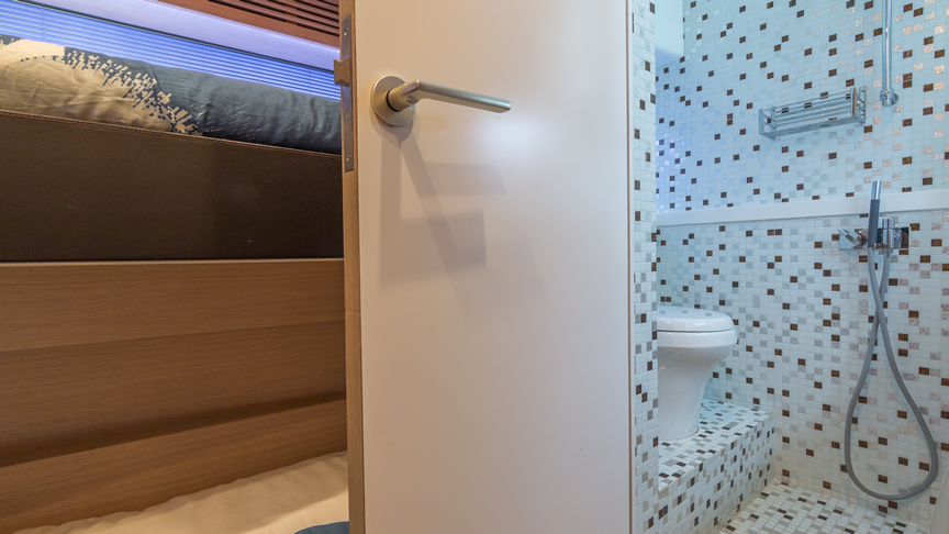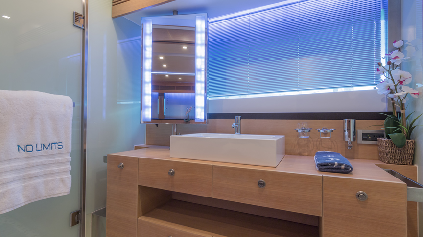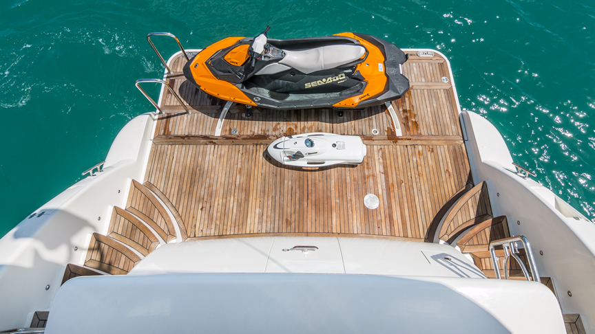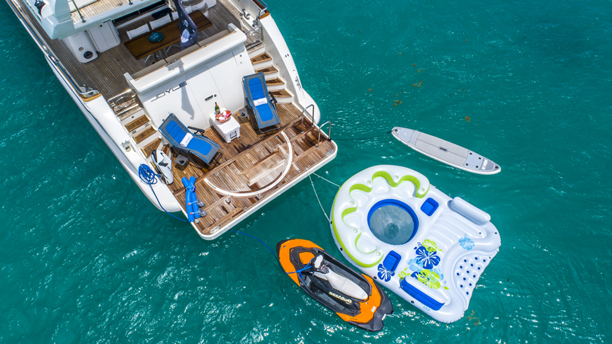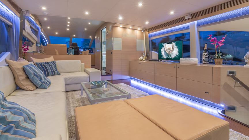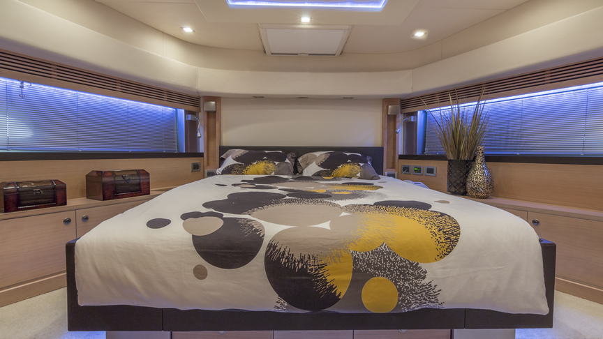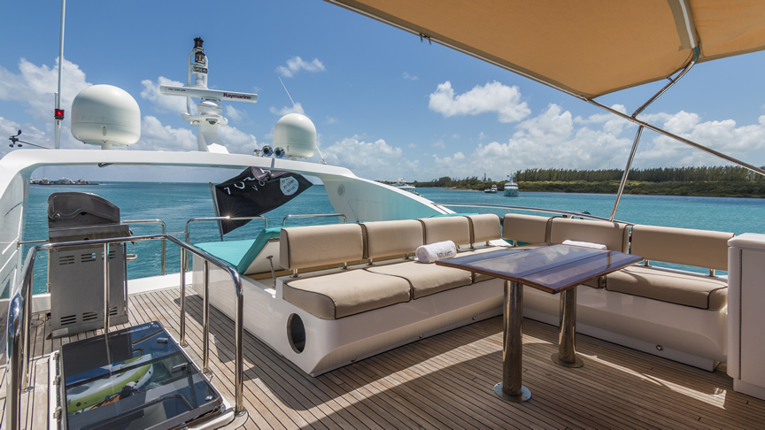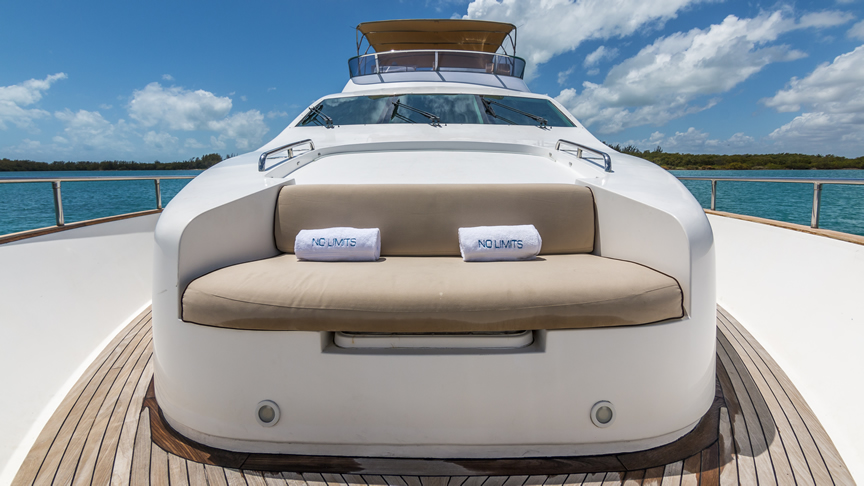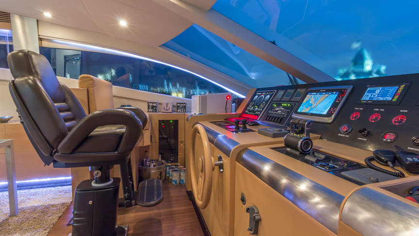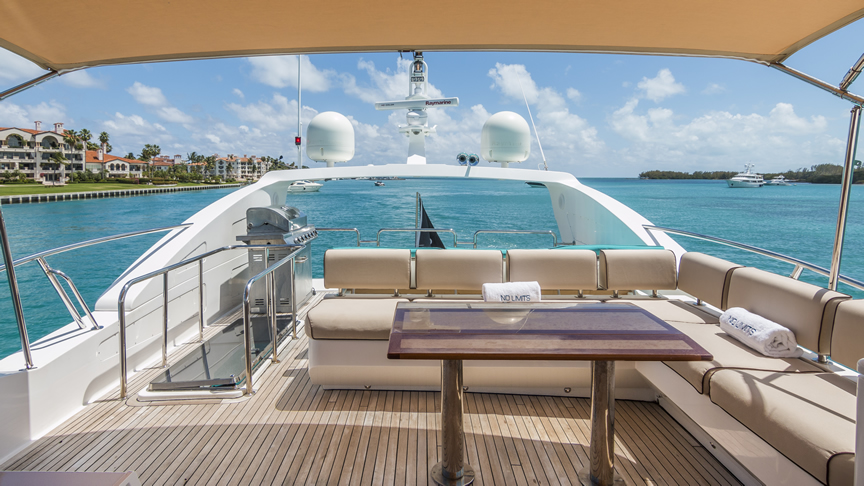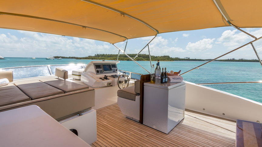 For total luxury, choose the 84 Joyce Flybridge. On the deck, have a drink with your guests, then relax in the jacuzzi. The full galley features a center kitchen island, stainless steel appliances, and a seating area with a leather sofa for guests. The salon holds a large dining room table, cream colored sofas and love seats, and grand picture windows for stunning 360 degree views. With five staterooms, this boat is ideal for large group term charters. A walk around deck and spacious interior make this boat feel much larger than its size.