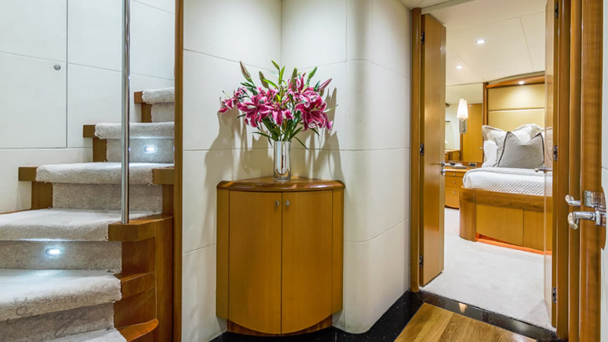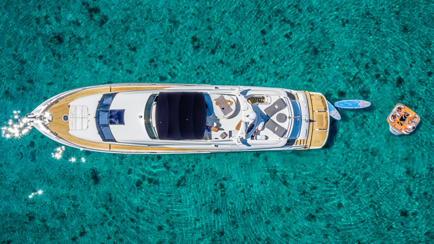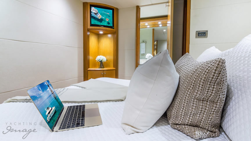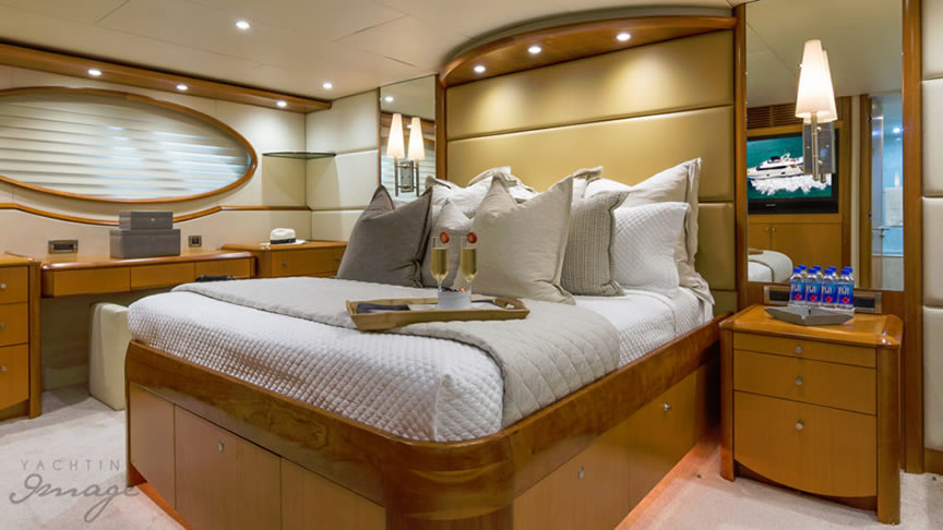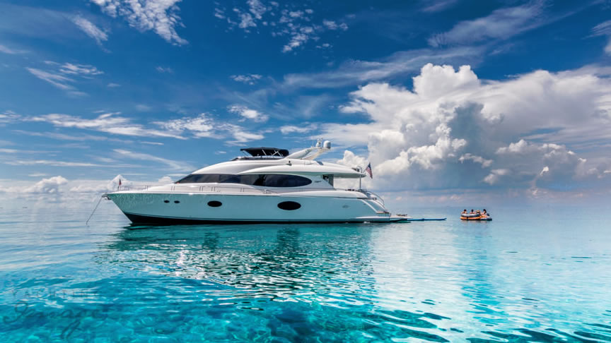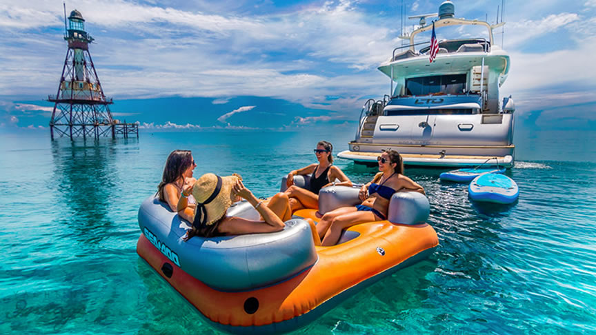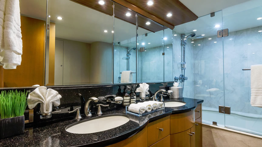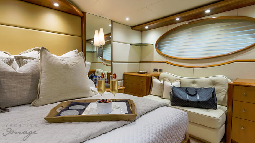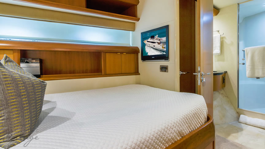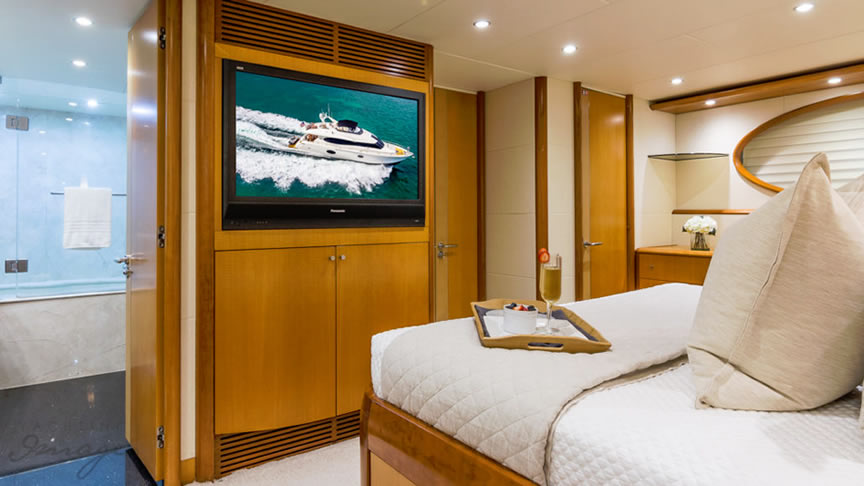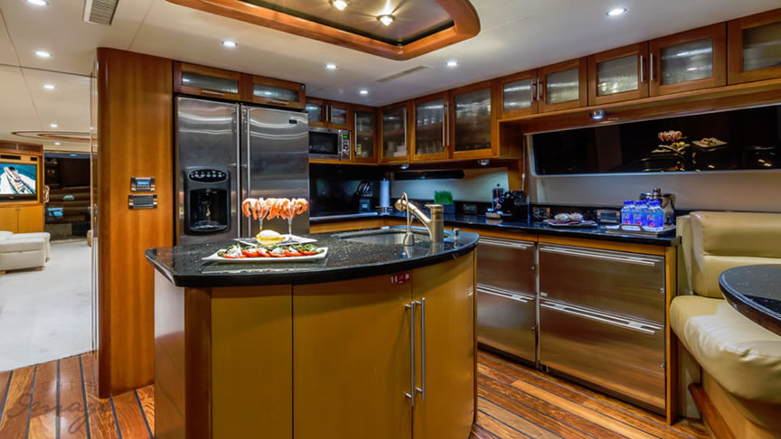 For total luxury, choose the 84 Lazzara Yacht w/ Jacuzzi for your next Miami Yacht Charter. One of a kind custom made Lazzara Flybridge Yacht. On the deck, have a cocktails with your guests, then relax in the Jacuzzi overlooking beautiful waters of Miami. The full galley features a center kitchen island, stainless steel appliances, and a seating area with a leather sofa for your charter guests. The salon holds a large dining room table, cream colored sofas and a love seats, and grand picture windows for stunning 360 degree views. With five staterooms this boat is ideal for large group term charters & Bahamas trips. A walk around deck, spacious interior & all the water toys make it a perfect Miami Charter Yacht.