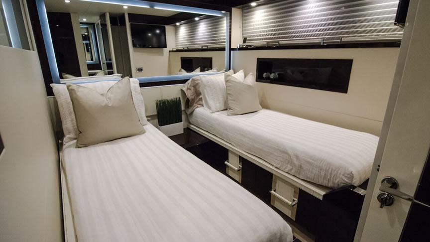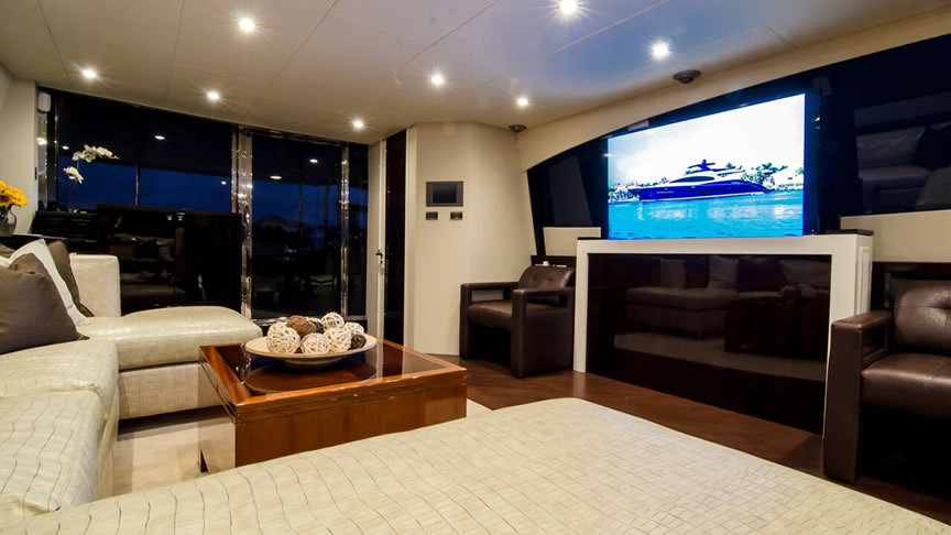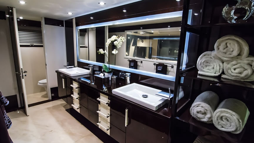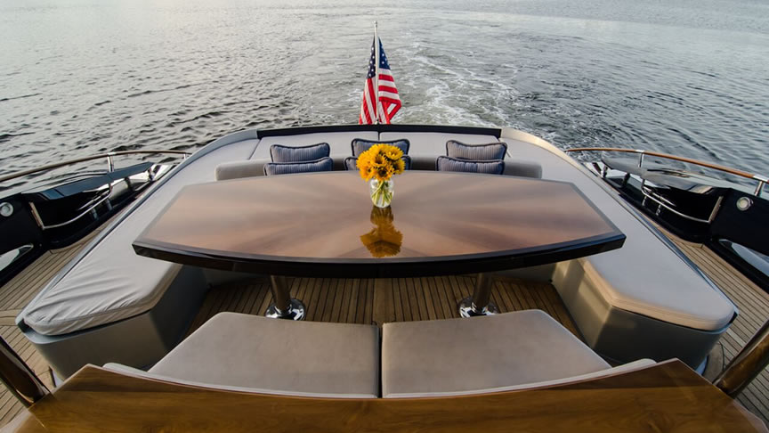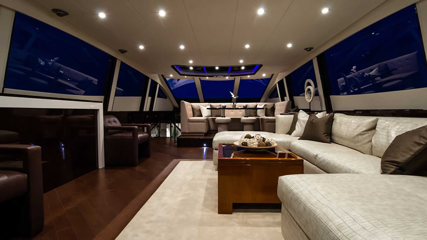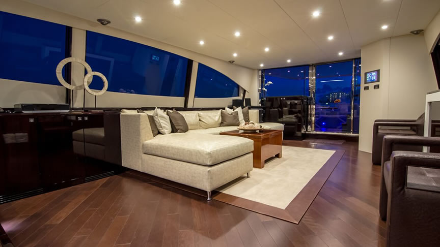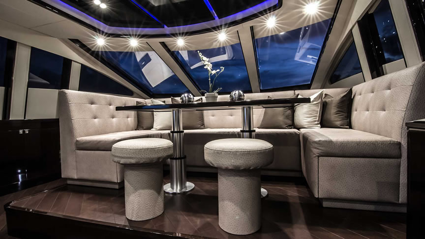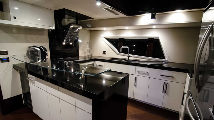 For total luxury, choose the 92 Lazzara LSX. On the deck, have a drink with your guests, then relax in the jacuzzi. The full galley features a center kitchen island, stainless steel appliances, and a seating area with a leather sofa for guests. The salon holds a large dining room table, cream colored sofas and love seats, and grand picture windows for stunning 360 degree views. With five staterooms, this boat is ideal for large group term charters. A walk around deck and spacious interior make this boat feel much larger than its size.